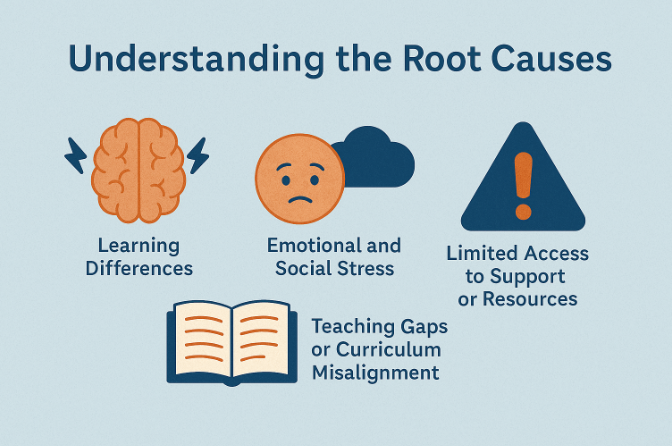 Children may fall behind academically for a variety of reasons learning differences, emotional stress, lack of access to resources, frequent school changes, or even health issues (National PTA, 2021). Some common signs include falling grades, reluctance to go to school, difficulty completing homework, or behavior changes such as irritability or withdrawal (CDC, 2023).